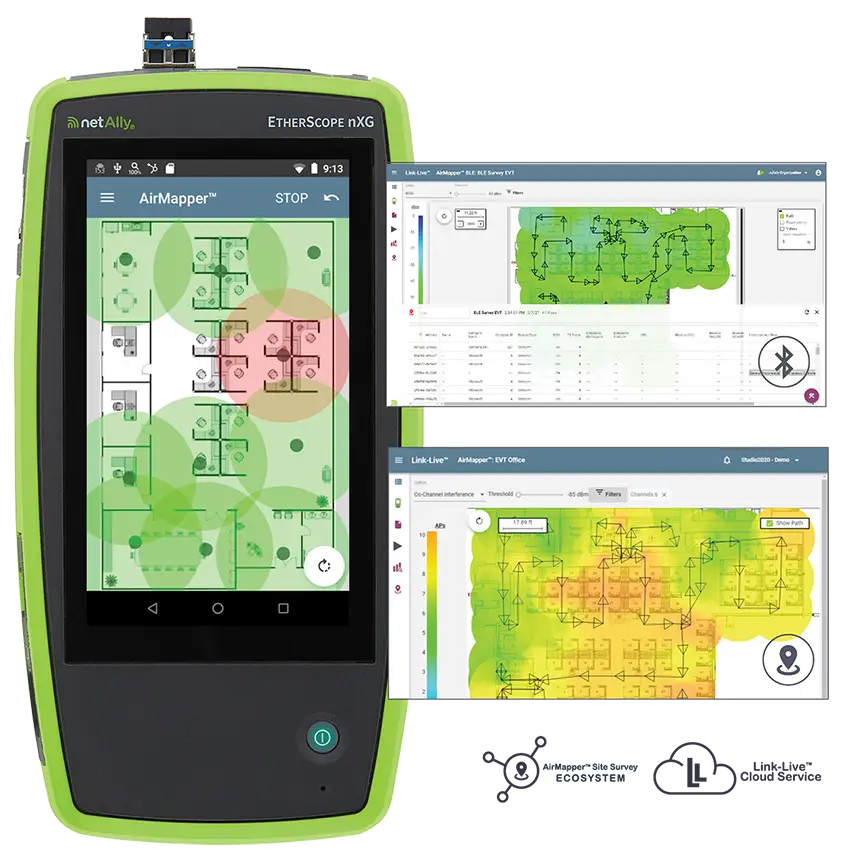 • Uses WiFi and Bluetooth site data collected with an AirCheck™ G3, EtherScope® nXG, CyberScope® or CyberScope® Air