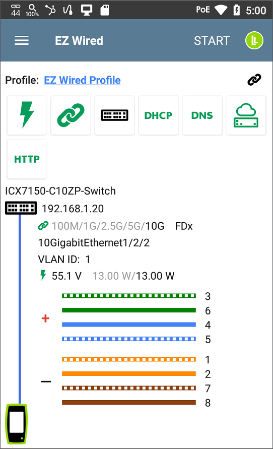 - Advanced Cable Diagnostics Conducts detailed cable tests, including length measurement, wiremap, and fault location for copper (RJ45)
